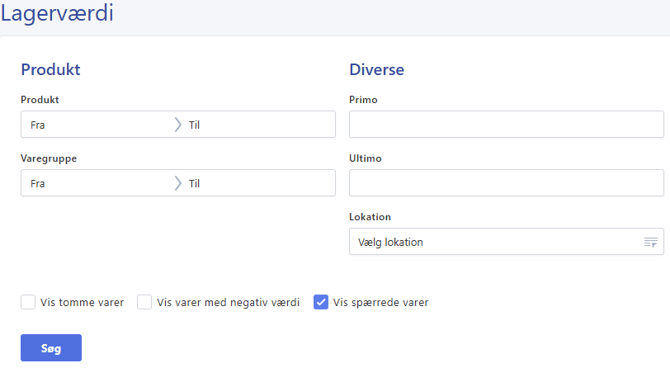 Hvis du ikke vælger nogen filtre, kan du blot klikke på Søg for at få en samlet oversigt over hele lageret.