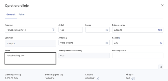 - Tilføj varelinjen forudbetaling som to separate linjer på ordren.