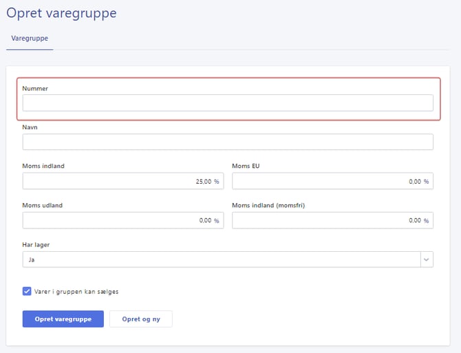 Nummer: Indtast et unikt nummer for varegruppen. Dette nummer vil blive brugt til at identificere gruppen i systemet.