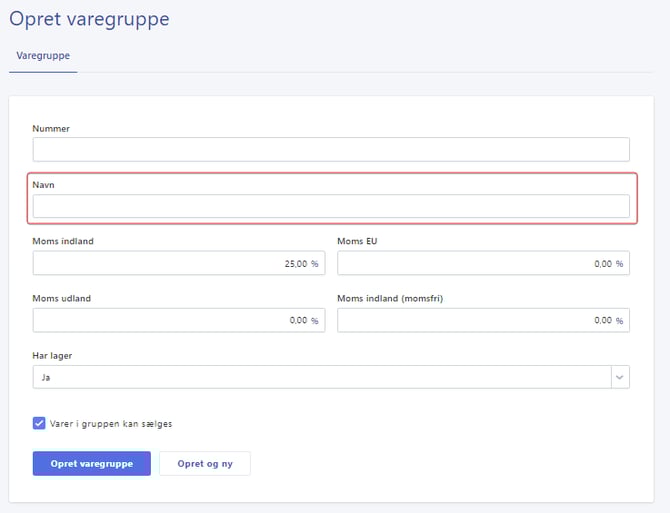 Navn: Giv din varegruppe et sigende navn. Navnet kan beskrive, hvad varegruppen indeholder, som for eksempel "Fysiske Varer" eller "Ydelser".