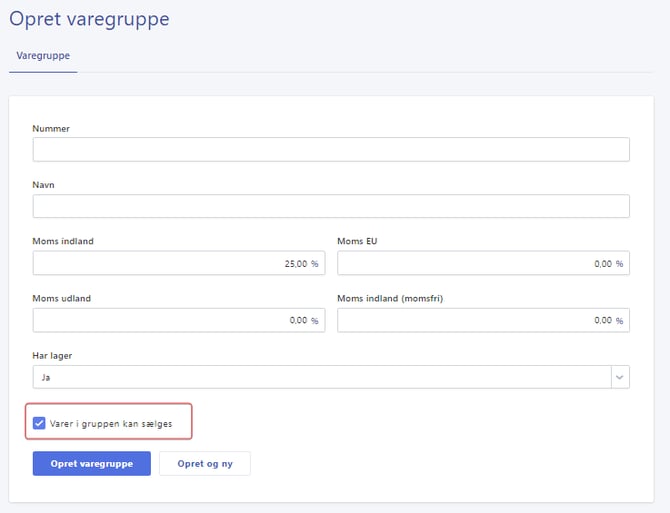 Varer i gruppen kan sælges: Vælg, om varerne i varegruppen skal kunne sælges. Dette er nyttigt, hvis du for eksempel har komponenter, der bruges internt i produktionen og ikke skal sælges til kunder.