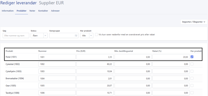 - Bevæg dig til den specifikke leverandør > klik på rediger og find området "Varer" for at tildele rabatter.