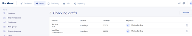 Gå til Varer -> Optælling og klik ''Bogfør alle / Book all''