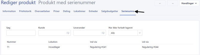 - Gå ind på den specifikke vare, og find fanen ''Serienumre'' for en liste over alle tilknyttede serienumre.