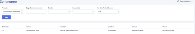 - Brug rapporten for serienumre for et samlet overblik. Gå til Rapportering - Serienumre: