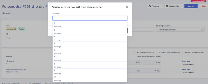 Er der ikke valgt serienummer på ordren, må det vælges ved bekræftelse af forsendelse.