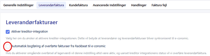 - Deaktiver automatisk bogføring af overførte faktura fra Rackbeat til e-conomic: