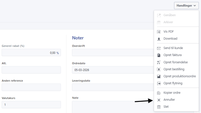Ønsker du alligevel at fjerne ordren fra overblikket, kan den i stedet annulleres.