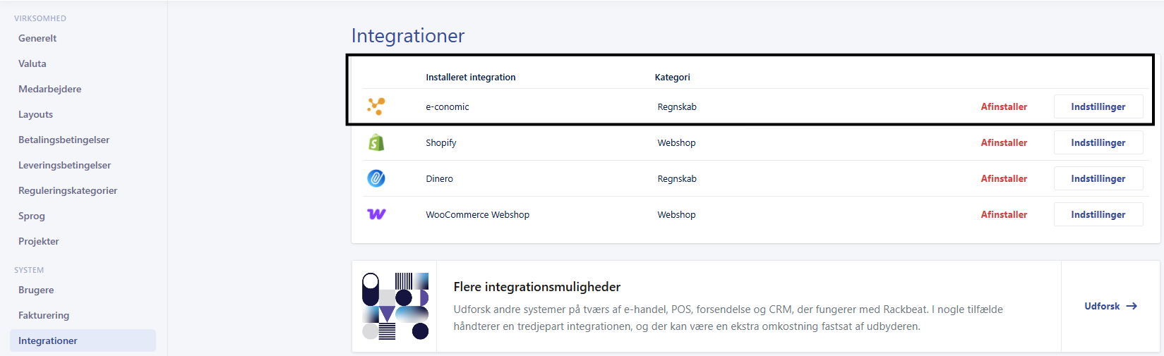Gå til "Integrationer" og klik på "Indstillinger" ved din e-conomic-integration: