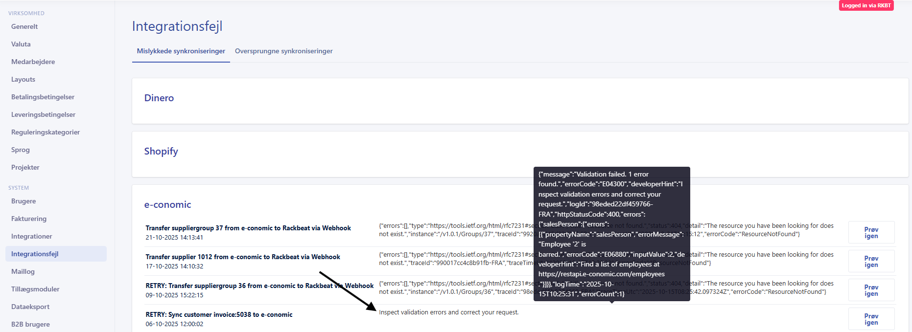 - Gå til Virksomhedsindstillinger - Integrationsfejl