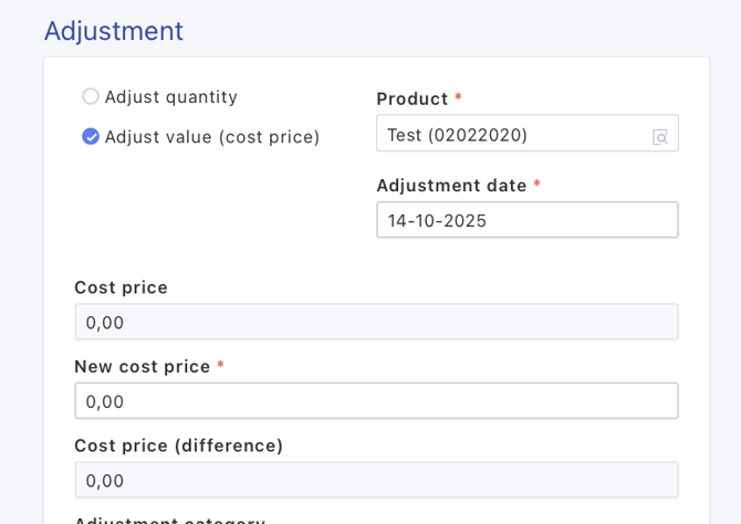 b. "Cost price (difference)" shows the difference between the new and former cost price. - Complete the adjustment: Add an Adjustment Category, Reason, and Description, then click "Adjust cost price" to complete. Remember to post the adjustment in the adjustment overview to update the cost price.