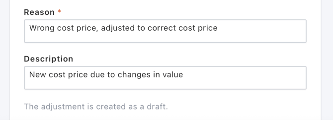 Add an Adjustment Category, Reason, and Description. Click Adjust quantity + value to complete the adjustment. Remember, the adjustment is saved as a draft and must be booked before it updates your inventory.