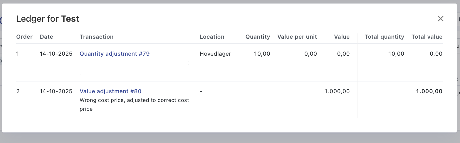 7. See changes: You can see your adjustments on the product ledger. You can find the ledger by going to your product overview and hovering over the three dots on the right side of the line of the product, and selecting "ledger".