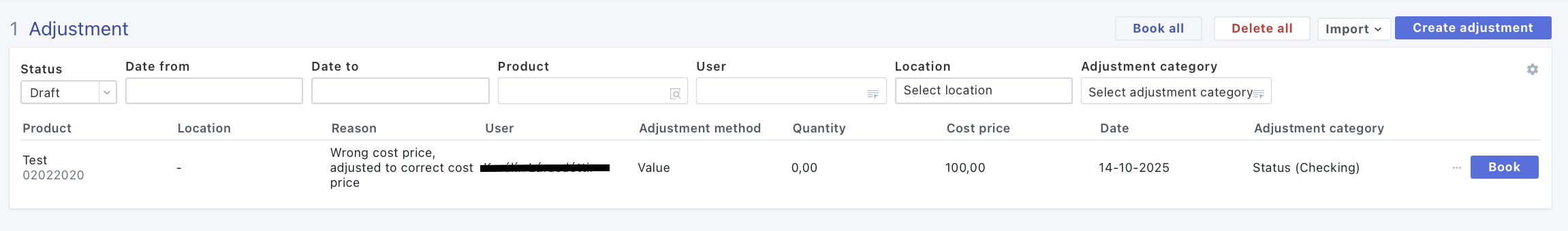 6. Book your adjustment: To apply the adjustment to your inventory, it must be booked in the adjustment overview