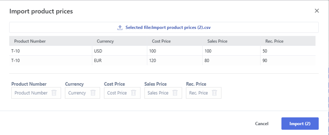 Cost price / Sales price / Recommended price – Empty cells will clear existing prices