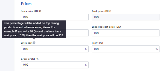 If you enter a percentage of 10% and the item's original cost price is 10 DKK, the new cost price recorded in the inventory will be 11 DKK.