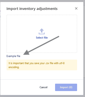 - Click "Import" in the upper-right corner, and click on 'Example file' to download a template: