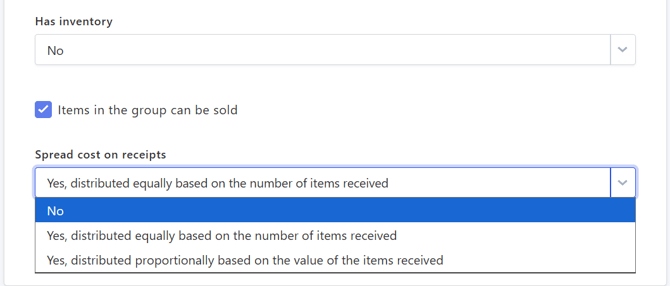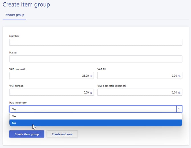 When Has stock is set to No on the item group, new options will appear: