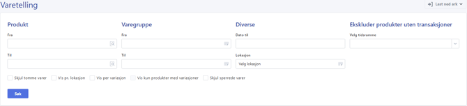 Lokasjon: Se lagerbeholdning for én lokasjon. - Ekskluder produkter uten transaksjoner: Trekk kun rapport for produkter uten transaksjoner i en valgt periode.