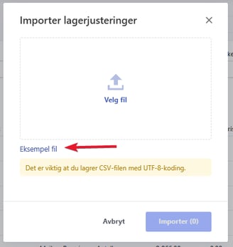 Den finner du under Varer → Justeringer → Importer → Eksempelfil: