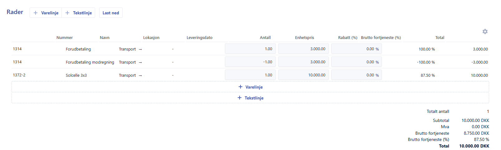 1 linje med forskuddsbetalingen i negativt antall.