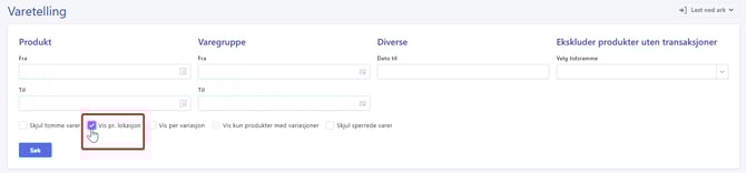 - Arbeider du med flere lokasjoner og ønsker å telle varene på alle, huk av for «Vis per lokasjon»: