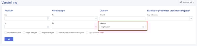 Her kan du filtrere visningen etter varer, varegrupper, dato og lokasjon.- Arbeider du med flere lokasjoner og ønsker å telle varene på alle, huk av for «Vis per lokasjon»:
