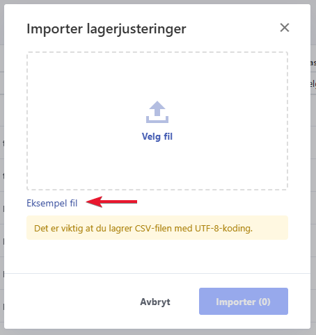 - Trykk på 'Importer' øverst i høyre hjørne, og trykk på 'Eksempel fil' for å laste ned en mal: