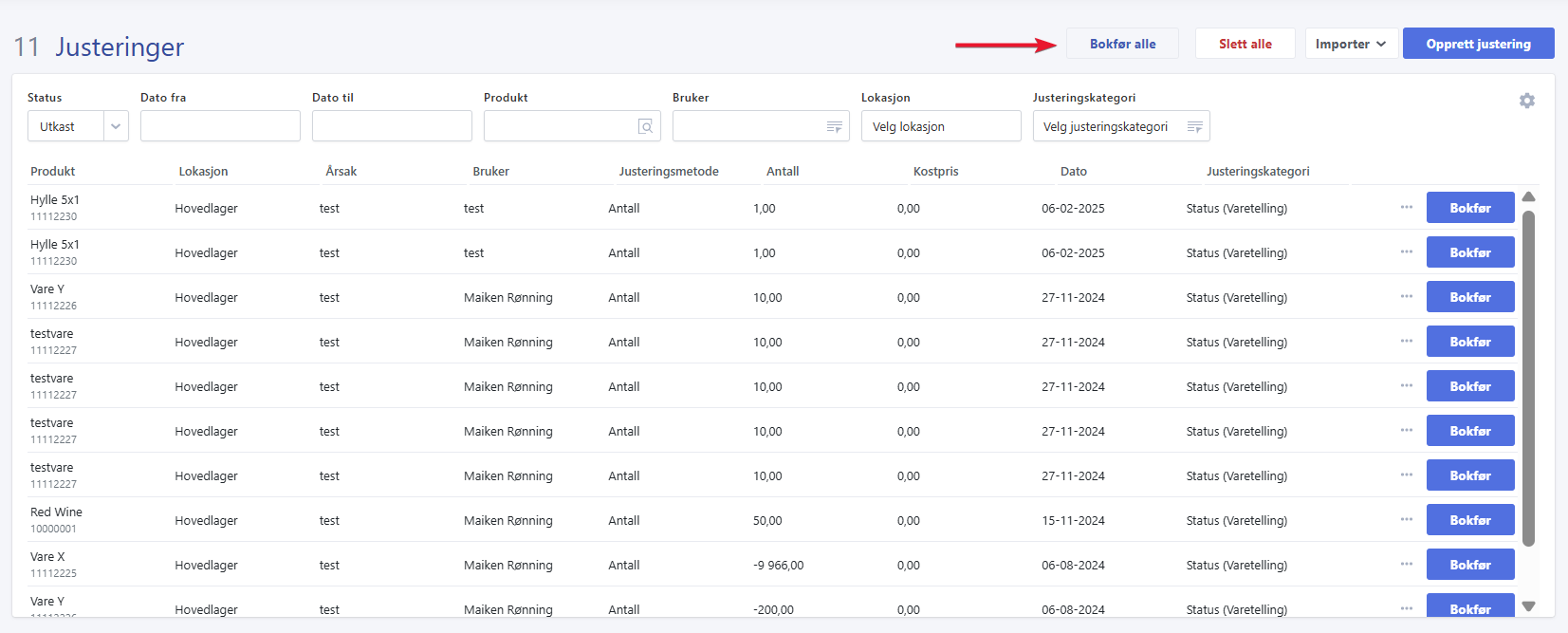 Klikk på 'Bokfør alle' for å fullføre varetellingen.