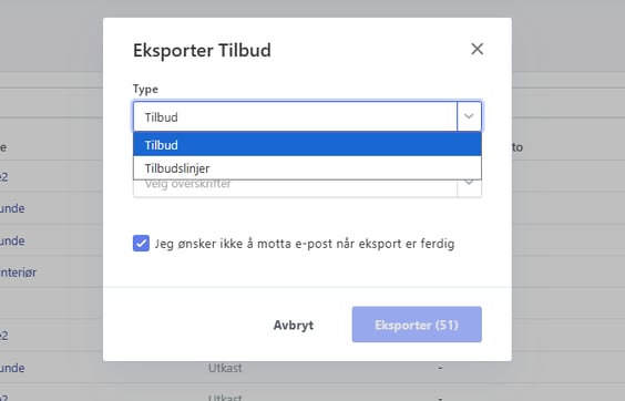 Tilbud - Med denne funksjonen eksporterer du overordnet data for tilbudene i oversikten. Dette inkluderer all informasjon på tilbudet, som dekningsbidrag, totalpris, brukerdefinerte felter m.m.