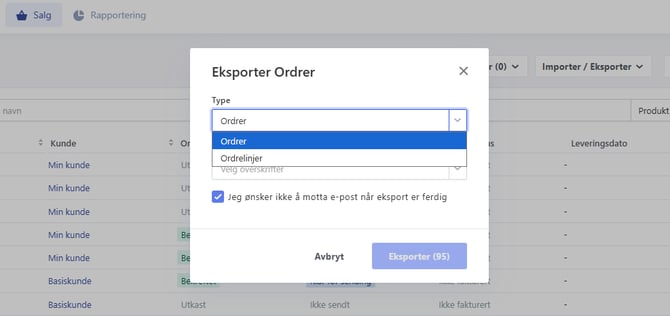 Du velger ett av disse alternativene under 'Type' i pop-up-vinduet når du åpner eksport, som du finner via Salg → Ordrer → Importer / Eksporter: