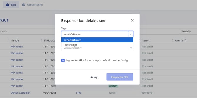 Du velger ett av disse alternativene under 'Type' i pop-up-vinduet når du åpner eksport, som du finner via Salg → Fakturaer → Importer / Eksporter: