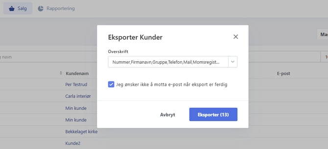 Velg de relevante overskriftene (eller klikk på 'Velg alle' nederst), og klikk deretter på 'Eksport' for å lage en fil med alle kundene i oversikten. Du finner funksjonen via Salg → Kunder → Importer / Eksporter: