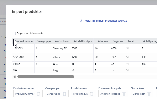 For å oppdatere eksisterende varer via import må du huke av for ‘Oppdater eksisterende’. Ved oppdatering av eksisterende varer må filen inneholde en kolonne for varenummer, samt én kolonne for hvert felt du ønsker å oppdatere.