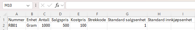 | Nummer | Enhet | Antall | Salgspris | Kostpris | Standard salgsenhet | Standard innkjøpsenhet |