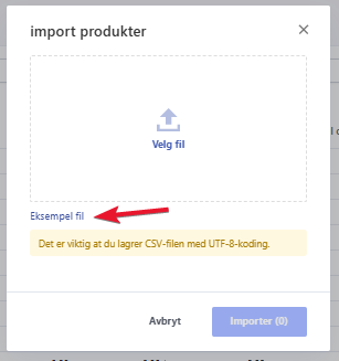 Den finner du under Varer → Produkter → Importer/Eksporter → Importer → Eksempelfil: