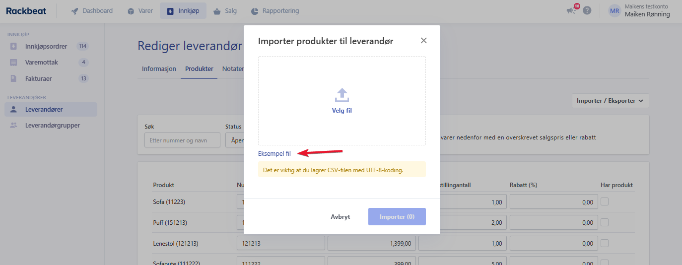 Du finner eksempelfilen under Innkjøp → Leverandører → velg en leverandør → Produkter → Importer/Eksporter → Importer.