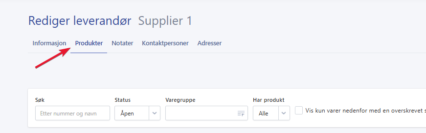 - Velg fanen 'Produkter' under leverandørens stamdata.